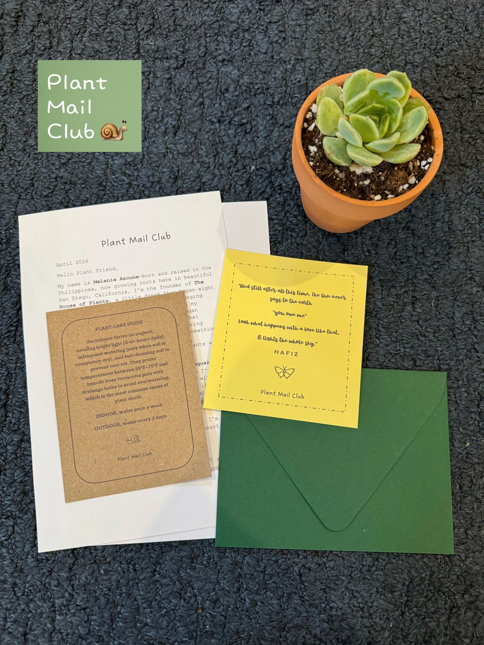 A little pause from the digital world. A way to nurture something living. A reminder that self- care can be slow, quiet, and rooted in nature. Your monthly subscription comes with a surprise plant, a personal letter, inspirational quote & stickers in one box delivered to your door. Billed monthly, cancel anytime.